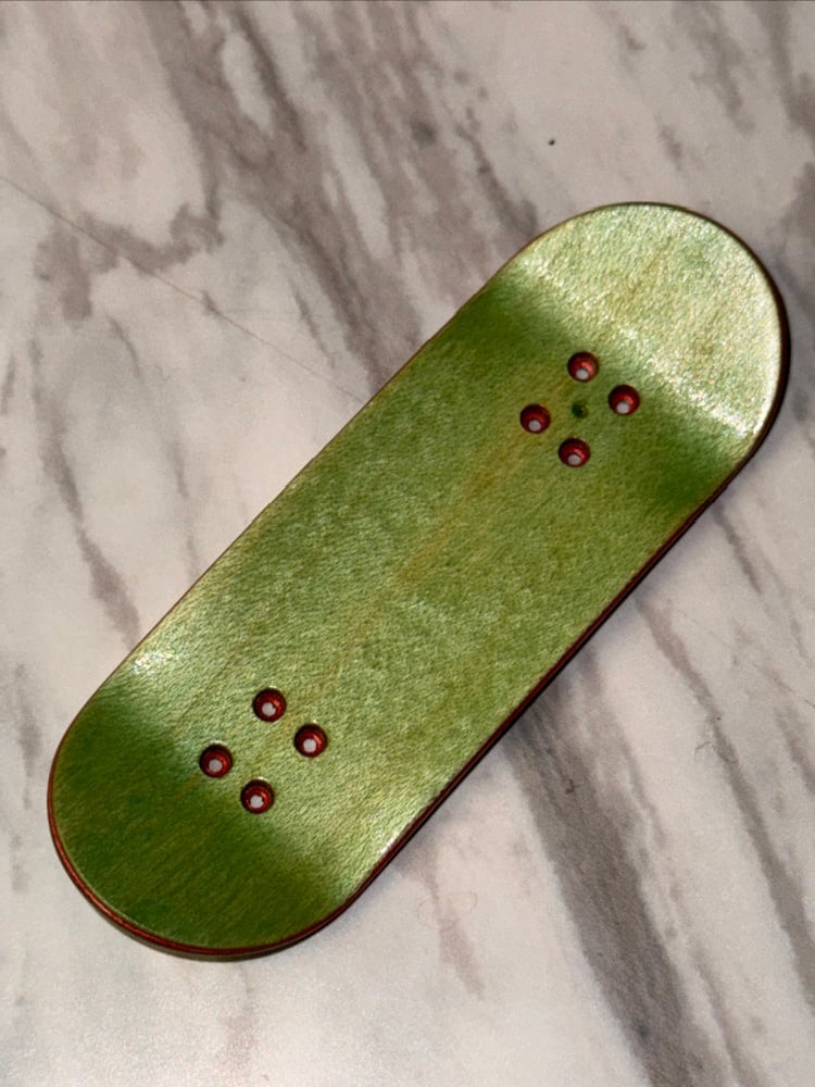 33mm Wide by 95mm Long and 2.5mm Thick. 100% maple deck! Dyed in house plies from top to bottom are green, red, green, red, green. Comes with 1 sheet of our premium .5mm Primo Tape and 1 sheet of our 1mm Meta theory tape stickers are also included!