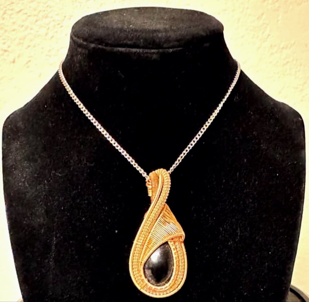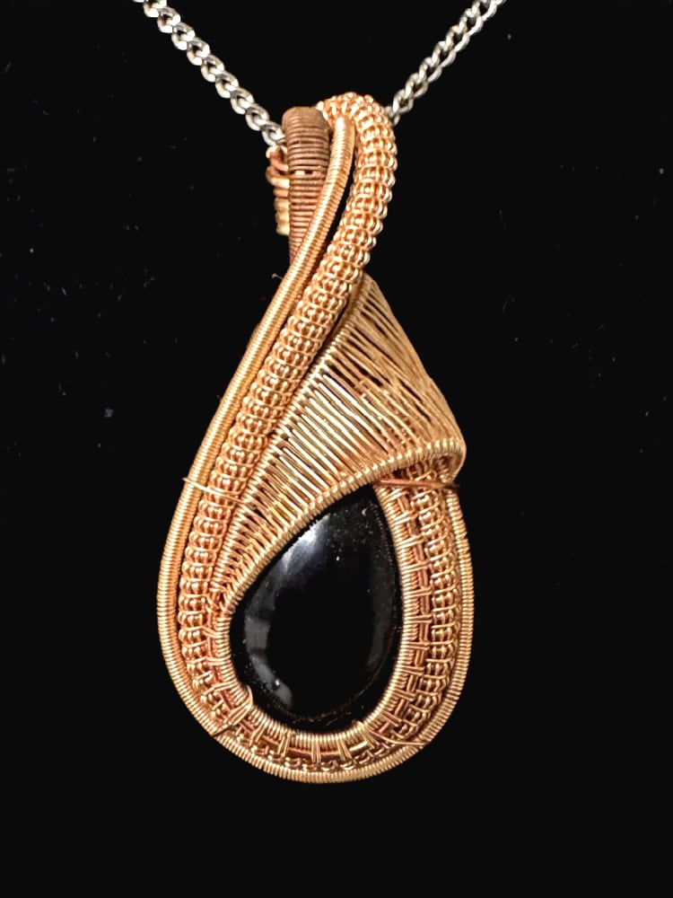 Black hand made resin cabochon hand wrapped in copper wire. Pendant is 2.25 inches tall 1 inch wide. Chain not included.