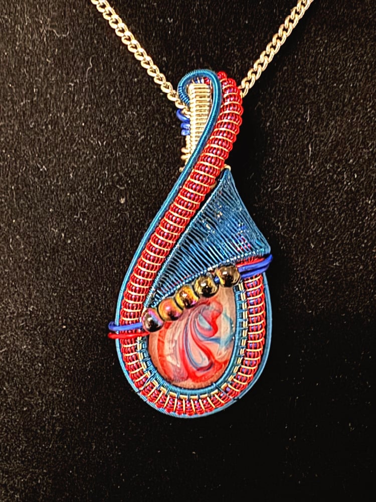 Hand made red white and blue resin cabochon wrapped in silver plated and colored copper wire. Pendant is 2.5 inches tall and 1.25 inches wide. Chain not included.